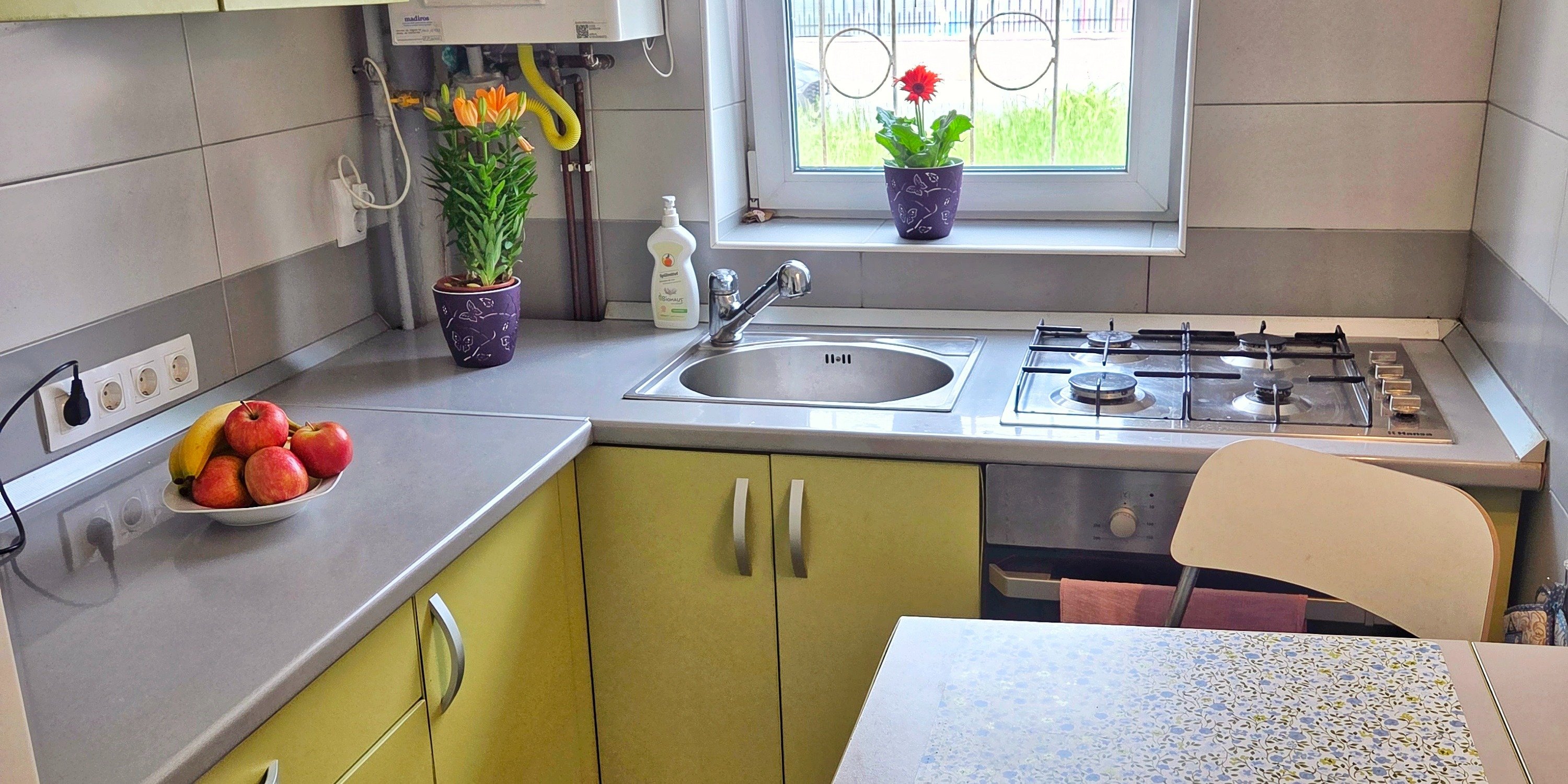 Gunoiul menajer se aruncă sub chiuvetă. Pentru reciclare, folosește tomberoanele etichetate din curte (plastic, hârtie, sticlă).
